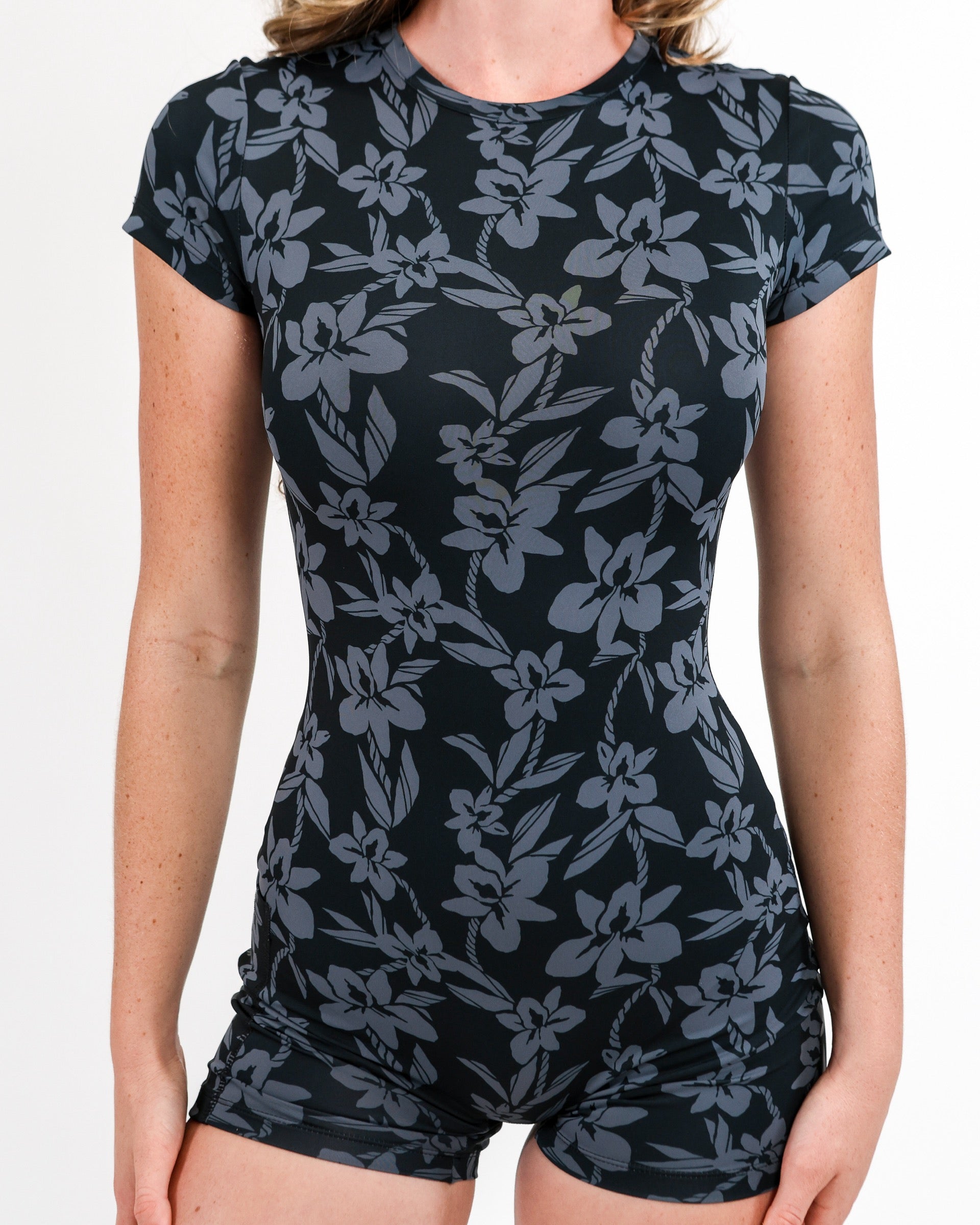 Our T-Shirt Jumpsuit is designed with a scoop neck front, short length sleeves and zipper entry at back. This jumpsuit does NOT include removable padding.